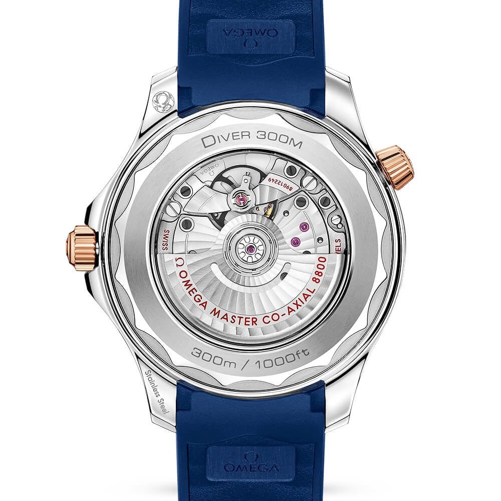 Omega extends its ocean heritage and updates the Seamaster 300 series with several innovative Features. This 42mm model has been crafted from the brand’s proprietary 18ct Sedna gold and stainless steel. Its blue ceramic bezel with a Ceragold diving scale is both legible and unidirectionally rotating for ultimate safety out on the water. The watch is 300-meter water resistant and topped with a scratch resistant and anti reflective sapphire crystal glass front, which protects the surface of a polished blue ceramic dial. This display also Features laser-engraved waves and a date window at 6 o’clock. Raised indexes are crafted from 18ct Sedna gold and are filled with white Super-LumiNova, while the helium escape valve has been given a conical design to promise an easy grip, similar to the screw-down crown at 3 o’clock. This men’s Omega Seamaster Diver 300 watch is powered by the Master Chronometer Calibre 8800, which provides a 55-hour power reserve. The movement is exposed through a sapphire crystal glass panel attached to a caseback with an engraved wave design. The luxury dive watch is also fitted on a blue rubber strap for ultimate comfort.