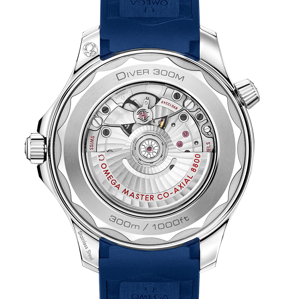 The 300-metre water resistant stainless steel model is completed on a supple blue structured strap with a steel buckle and clasp and Features a sapphire-backed case for exposing the decoration and performance of an in-house movement. The OMEGA Master Chronometer Calibre 8800 promises a 55-hour power reserve and is resistant to magnetic fields up to 15,000 gauss.