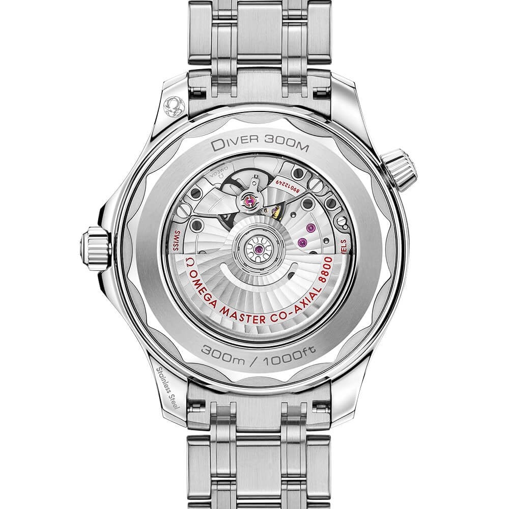 This Omega Seamaster Green Professional Diver 300M watch is fitted with a screw-down crown at 3 o’clock and a helium escape valve for saturation diving at 10 o’clock. The professional dive watch for men is powered by the Master Chronometer Calibre 8800 which provides a 55-hour power reserve once fully wound.