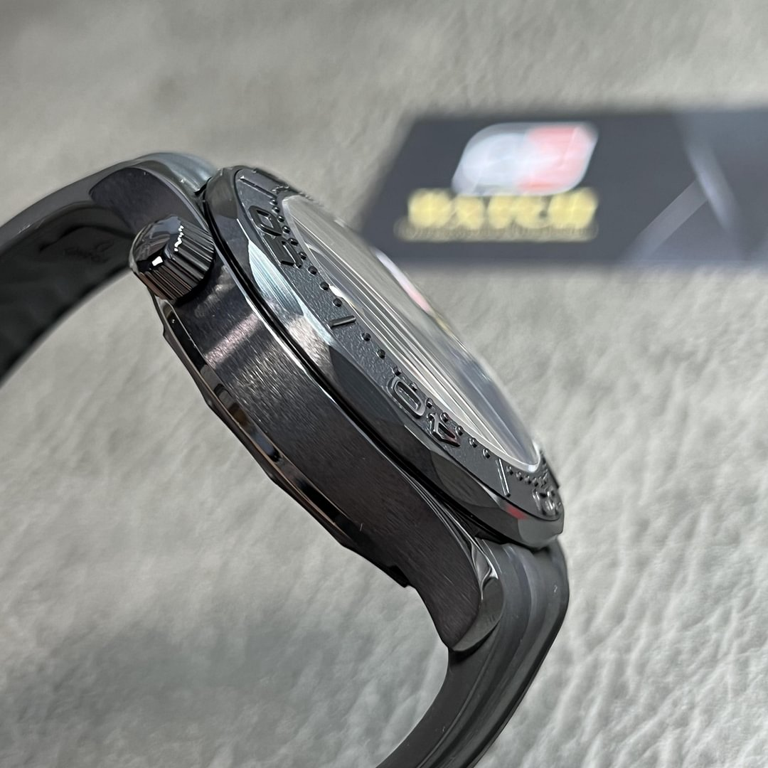 This striking 43.50mm model is crafted with black ceramic [ZrO2], creating a distinctive and uniform look. The case, bezel, wave-pattern dial, crown, and helium escape valve all share the same exquisite material. To maintain visibility without compromising the aesthetic, anthracite Super-LumiNova has been applied to the diving scale, black PVD indexes, skeleton hands, and the dot at 12 o’clock.