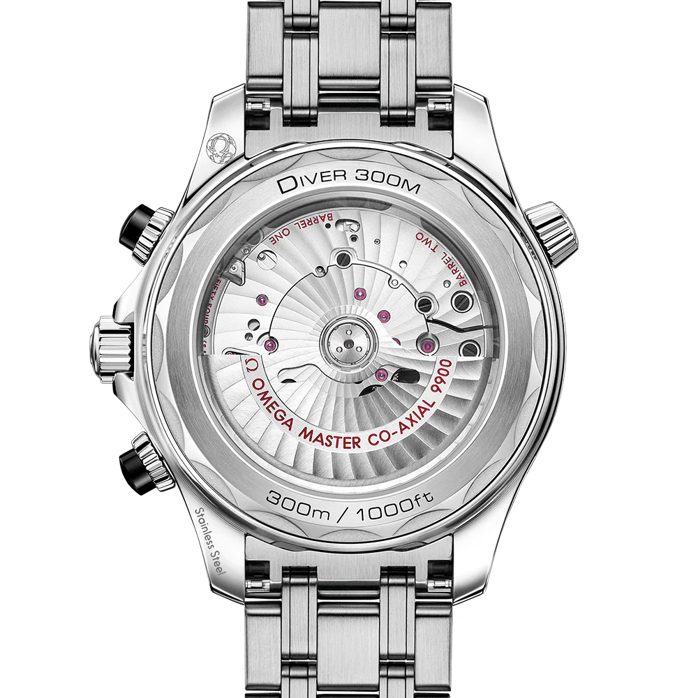 Some of the special Features of the Omega Seamaster Diver 300M watch are its legible dial, easy-to-handle diving bezel and helium escape valve. This model from the popular series, which first launched in 1993, is crafted from stainless steel and integrated with 300-meter water resistance. Its screw-down caseback with wave-effect edging is equipped with an anti reflective sapphire crystal glass exhibition feature for granting an exclusive view into the performance of a chronometer-certified movement. The front of the case is also sealed with this strong domed glass, protecting a black polished ceramic dial with a polished and brushed laser-ablated wave-effect surface pattern. The dial also Features hands and indexes filled with Super-LumiNova to assist with timekeeping during the night. The Omega Seamaster Diver 300M watch is powered by the Master Chronometer Calibre 9900, which offers an impressive 60-hour power reserve whilst off the wrist. The engine is also protected against magnetic fields up to 15,000 gauss. This men’s 44mm Omega Seamaster Diver 300M watch Features black coated push-pieces at 2 and 4 o’clock to match a black ceramic unidirectional rotating bezel. Both pushers operate the chronograph functions. The dial of the Seamaster watch also Features a 12-hour sub-counter at 3 o’clock and a small seconds dial at 9 o’clock, balanced by a date aperture at 6 o’clock. The luxury dive watch comes complete on a brushed and polished stainless steel bracelet with a folding clasp.
