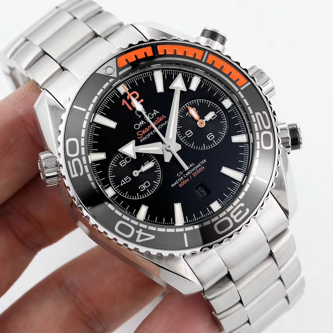 Stainless steel & black/orange ceramic 45.5mm case and bezel all on a stainless steel bracelet. This men’s watch has a black dial with polished and luminous applied hands and hour markers, date display at the 6 o’clock position. Water resistant up to 600m and sapphire crystal glass. Power reserve up to 60 hours. OMEGA calibre 9900 automatic chronograph movement.