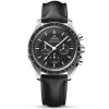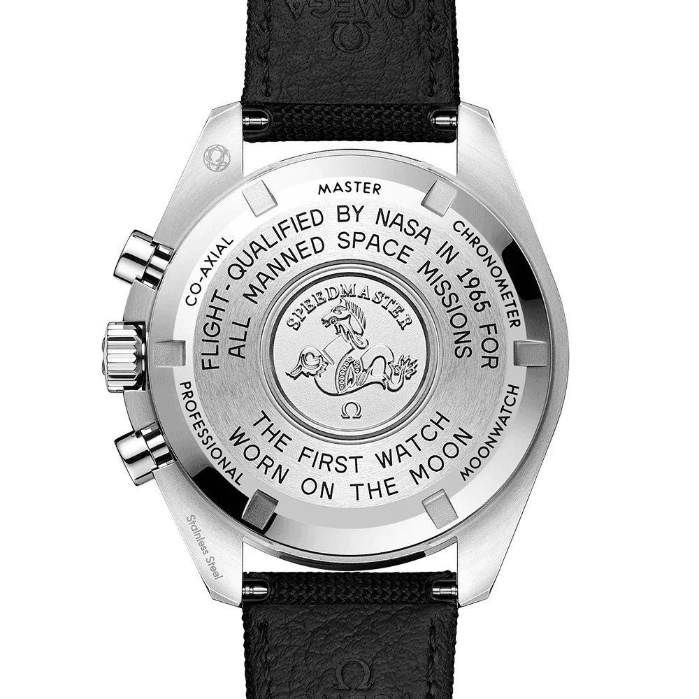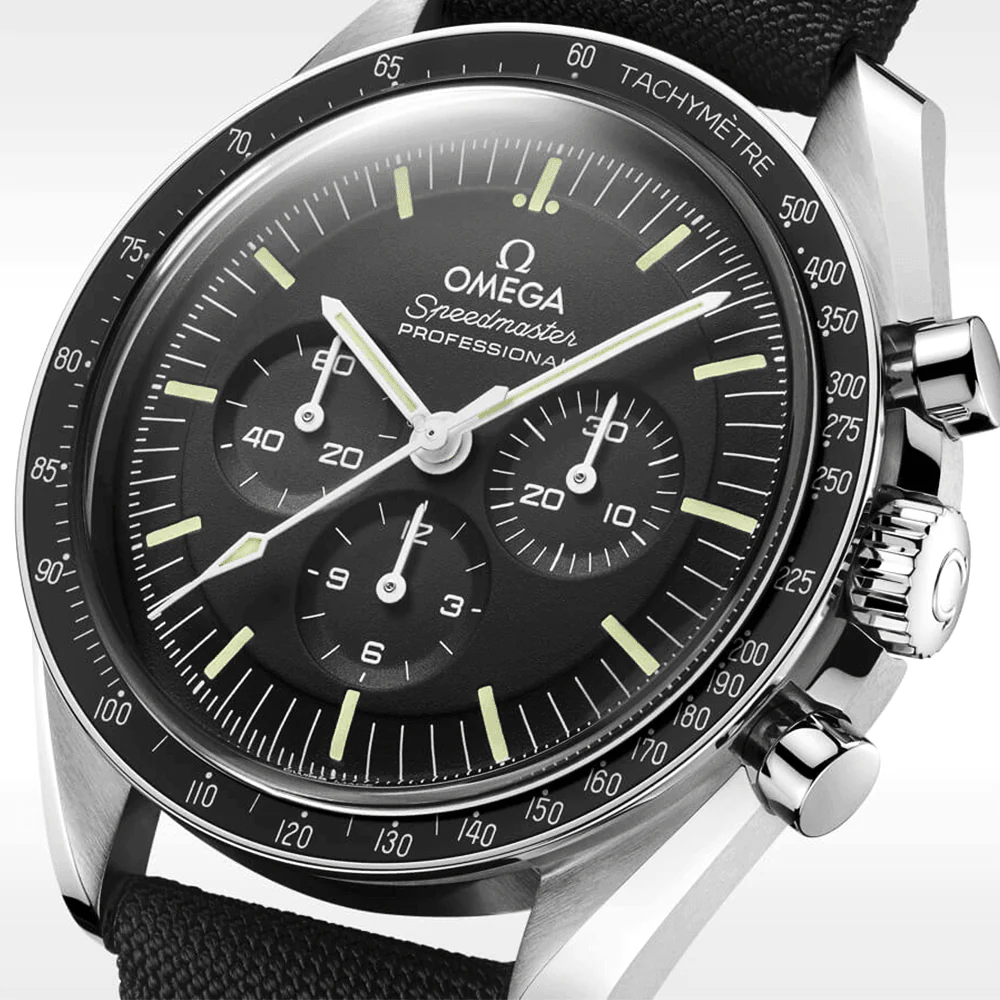 The tachymeter scale on the black anodised aluminium bezel ring Features a dot above the 90 marker, identical to the original Speedmaster Moonwatch Professional watches. To finish, its iconic design is completed on a black nylon fabric strap and a stainless steel buckle.