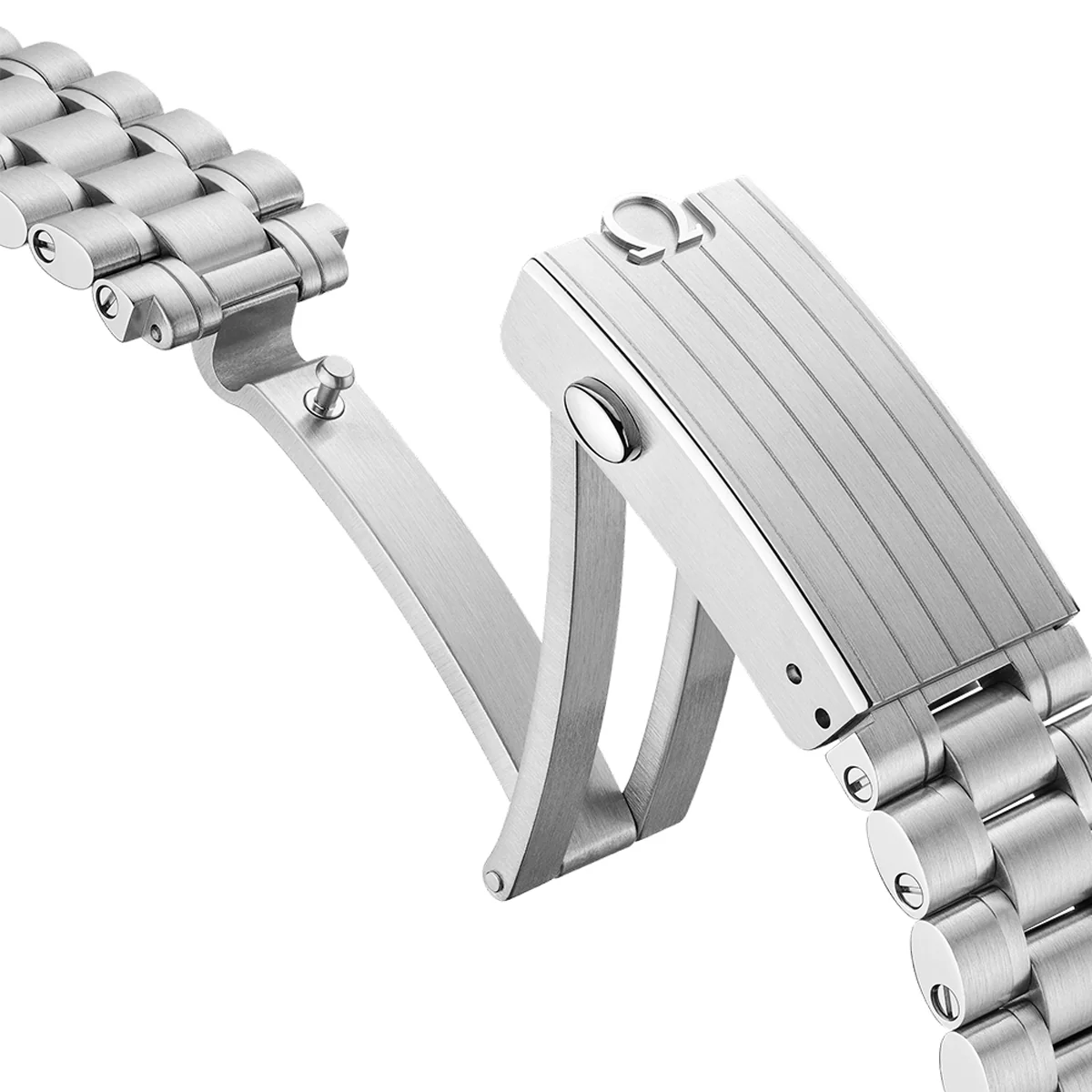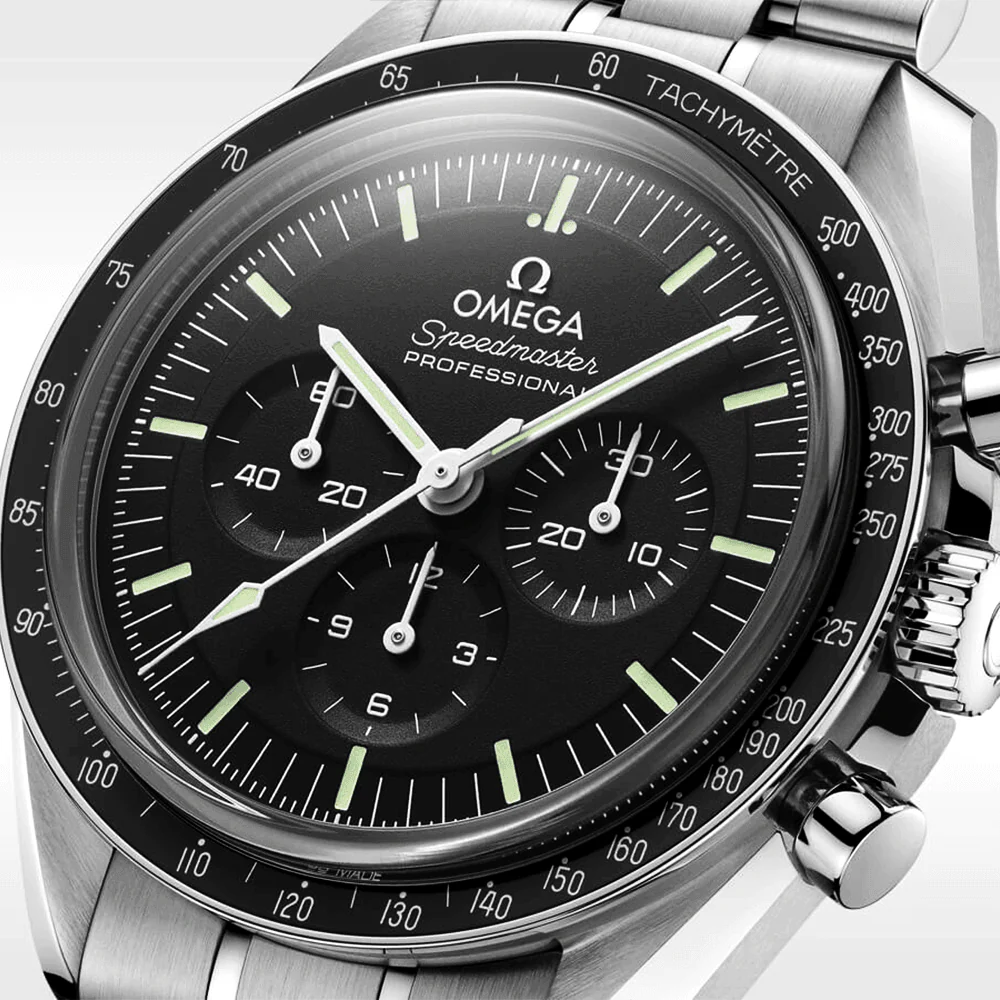 This 42mm OMEGA Speedmaster Moonwatch Professional Co-Axial Master Chronometer is 50-meter water resistant and is finished on a five-row stainless steel bracelet with polished and brushed arched links. The design of this men’s OMEGA Speedmaster Moonwatch Professional watch is inspired by the fourth generation of the icon and Features the famous dot over 90 on the anodised aluminium bezel ring.