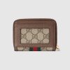 First used in the 1970s, the GG logo was an evolution of the original Gucci rhombi design from the 1930s, and from then it’s been an established symbol of Gucci’s heritage. This beige and dark brown Supreme wallet combines the signature motif with the green and red Web stripe, a timeless pairing that pays homage to Gucci’s roots.