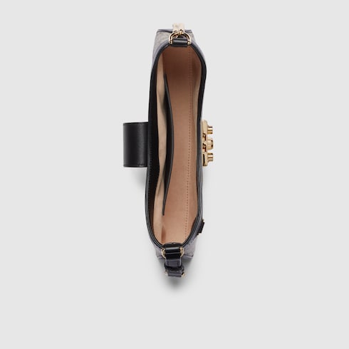 Drawing from the House’s origins as an artisanal luggage atelier, the Padlock closure features prominently on this small shoulder bag in beige and ebony GG Supreme canvas, with black leather trim, and a new adjustable leather and chain strap. It is complete with gold-toned hardware and key with leather holder.