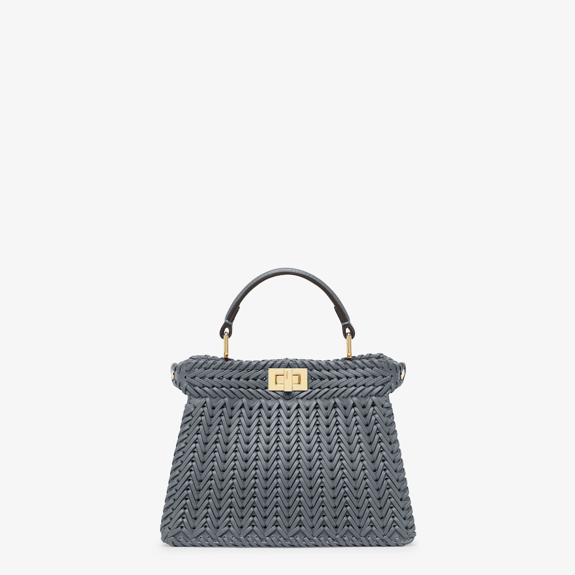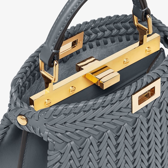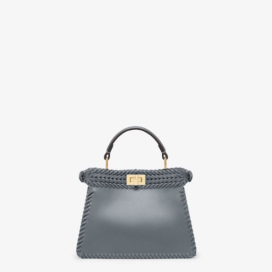 Iconic Peekaboo ISeeU bag in an ideal, compact size. Made of blue leather with borders and front panel embellished by a hand-crafted tone-on-tone interlacing. Decorated with the iconic twist lock on both sides.