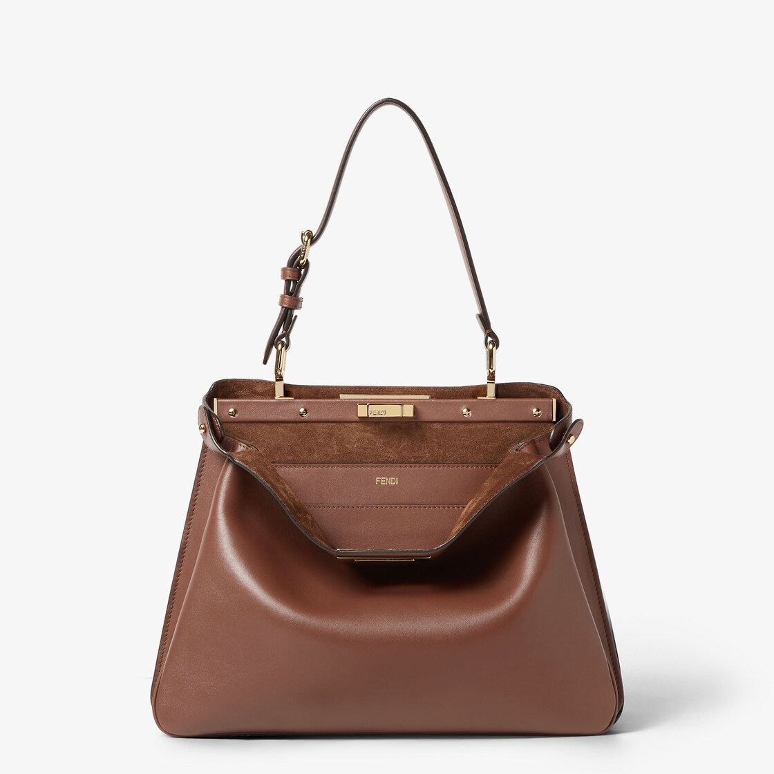 Featuring a suede-lined interior with two internal compartments divided by a stiff partition and a leather internal pocket with gold-colored FENDI logo print.
