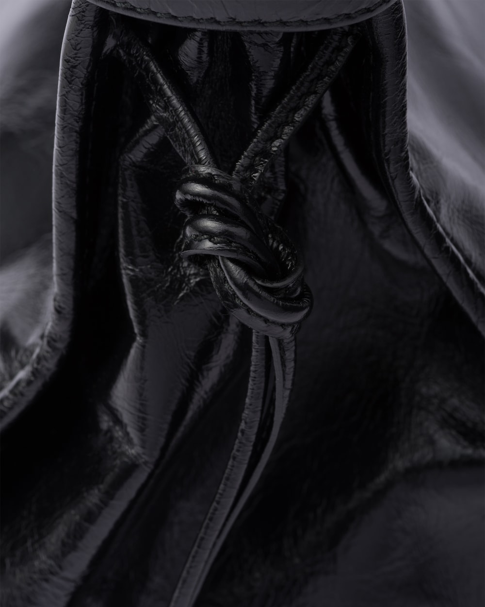 A pragmatic but refined design defines this handbag made of soft leather with a shiny finish that emphasizes its modern, versatile allure. The clean-lined silhouette blends different influences into one style with a sleek, distinctive aesthetic. Embellished by the sophisticated detail of narrow straps, the roomy bag has an interior equipped with zipper pockets. The enameled metal triangle logo completes the look with its iconic signature.