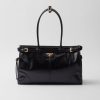 This pragmatic and refined handbag is made of soft leather with a glossy finish that emphasizes its versatile, modern allure. The geometric design blends different influences into one style with a distinctive but sleek aesthetic. Embellished by the sophisticated strap detail, the rectangular silhouette has zipper pockets inside. The enameled metal triangle logo completes the look with its iconic signature.