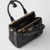 Production of the Prada Galleria bag, composed of 83 pieces, is an authentic fusion between industrial precision and the refined accuracy of craftsmanship that can only be performed by hand. The design is clean and elegant yet innately pragmatic, an aesthetic language blending form and function that combines history and modernity. Originating the definition of “timeless”, the Galleria bag has become a hallmark of Prada’s identity in the twenty-first century. The accessory, presented in the mini version, is made of iconic Saffiano leather that was patented by the founder of the brand and features a crosshatch texture and waxed finish.