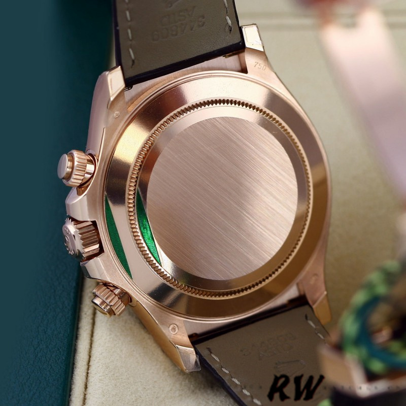 Rolex Cosmograph Daytona 116515 Ivory Dial 40mm Mens Replica Watch features a 40mm Everose gold case with a black Cerachrom bezel surrounding an ivory dial on a brand new black alligator strap with an Everose gold deployant buckle. Functions include hours, minutes, seconds and chronograph.