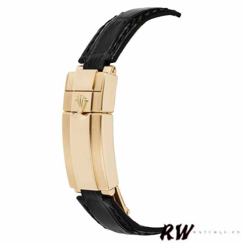 Rolex Cosmograph Daytona 116518 Black And Champagne Dial 40mm Mens Replica Watch.40mm yellow gold case, screw-down yellow gold back, screw-down crown and push buttons.Black monobloc Cerachrom bezel with engraved tachymetric scale, scratch-resistant double anti-reflective sapphire crystal, black dial with champagne subdials, index hour markers, Chronograph central second hand, 30-minute counter at 3 o’clock, and 12-hour counter at 9 o’clock. Black Leather strap made from flexible metal blades overmoulded with high-performance elastomer, Folding safety buckle with rapid extension system.