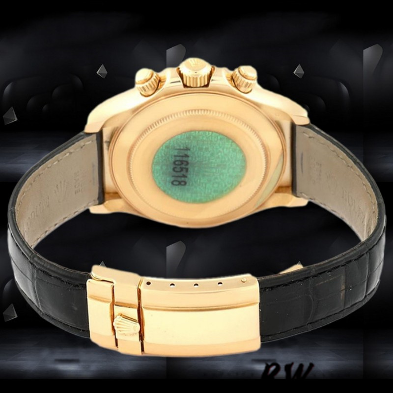 Rolex Cosmograph Daytona 116518 Champagne Dial Yellow Gold Bezel 40mm Mens Replica Watch.40mm Yellow Gold Case.Sapphire Crystal. Champagne Dial with Luminous Hour Markers,Yellow Gold Engraved Tachymeter Fixed Bezel , Black Leather Strap with Deployment Buckle.The minute mark around the outer edge of the glass is a design element that represents time.