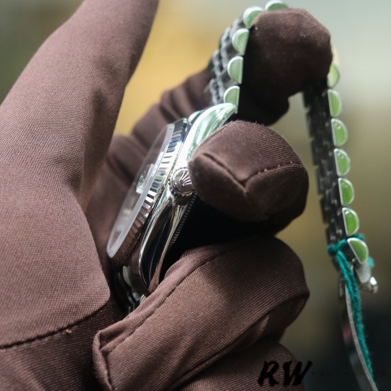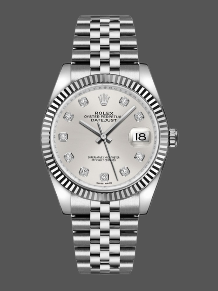 Rolex Datejust 116234-0084 Silver Diamond Dial 36mm Unisex Replica Watch.Its case measures a traditional 36mm.With a round white gold and stainless steel case. A stunning silver dial is adorned with 10 diamond hour markers and a date feature located at the 3 o’clock position displays hours, minutes, seconds, date. And surrounded by a solid white gold fluted bezel.