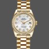 Rolex Datejust 179138 Blue Diamond Dial 26MM Lady Replica Watch featuring yellow gold oyster case 26mm in diameter.Yellow gold diamond bezel. Scratch resistant sapphire crystal with Cyclops magnifier.Blue dial with diamond hour markers.Date calendar at 3 o’clock aperture. Yellow gold president bracelet with hidden clasp.