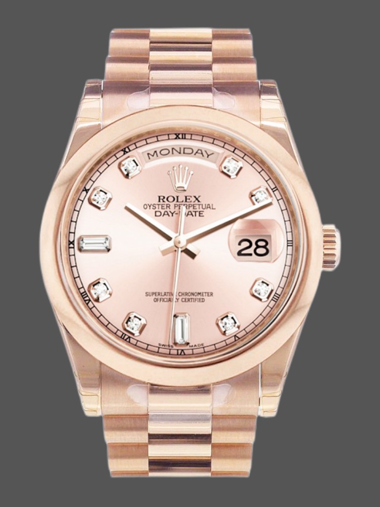 Rolex Day-Date 118205 Pink Diamond Dial 36mm Unisex Replica Watch. 36mm rose gold oyster case in diameter featuring a pink diamond dot dial housing an external Cyclops date aperture at 3 O’clock and a day aperture in-between 11 and 1 O’clock. The dial is surrounded by a rose gold domed bezel and the watch comes on a full retail length rose gold Rolex President bracelet.