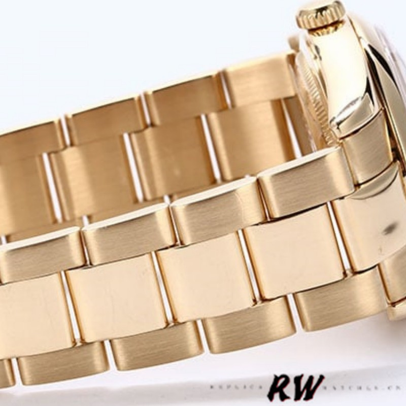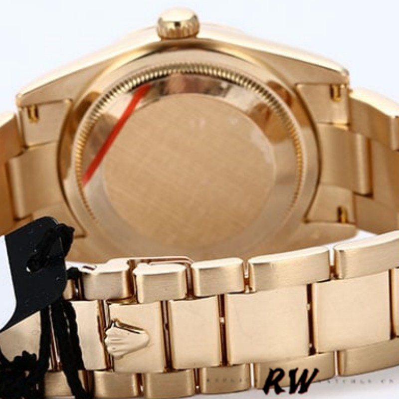 Rolex Day-Date 118208 Black Mother of Pearl Diamond Dial 36mm Unisex Replica Watch .36mm yellow gold case with a yellow gold Rolex president bracelet. Fixed domed yellow gold bezel. Black Mother of pearl dial with gold-tone hands and Diamonds numeral hour markers. Minute markers around the outer rim.Date display at the 3 o’clock position. Day of the week display centered on the 12 o’clock position. Scratch resistant sapphire crystal. Screw down crown. Solid case back. Round case shape.