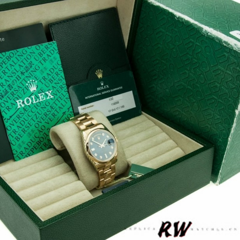 Rolex Day-Date 118208 Blue Diamond Dial 36mm Unisex Replica Watch has a Yellow Gold 36 mm Round Case with Screw Down Crown and a Yellow Gold Bezel. This Day-Date has an attractive Blue Dial with Diamonds Dial Markers. The reliable Yellow Gold President Bracelet will look great on your wrist.