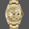 Rolex Day-Date 118208 Yellow Gold Domed 36mm Unisex Replica Watch. 36mm yellow gold case with a yellow gold Rolex president bracelet. Fixed domed yellow gold bezel. Bulls eye dial with gold-tone hands and Diamonds numeral hour markers. Minute markers around the outer rim. Date display at the 3 o’clock position. Day of the week display centered on the 12 o’clock position. Scratch resistant sapphire crystal. Screw down crown.