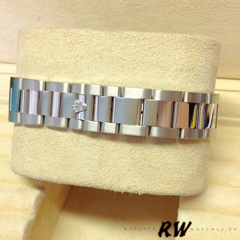 Rolex Day-Date 118209 Silver Diamond Dial Automatic 36mm Unisex Replica Watch featuring a silver diamond dot dial housing an external Cyclops date aperture at 3 O’clock and a day aperutre in-between 11 and 1 O’clock surrounded by a white gold domed bezel, polished finish shoulders and case sides. This particular watch comes on a white gold Rolex Oyster bracelet.