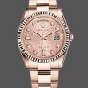 Rolex Day-Date 118235 Pink Diamond Dial 36mm Lady Replica Watch. 36mm rose gold oyster case in diameter.Rose gold fluted bezel. Scratch resistant sapphire crystal with Cyclops magnifier. Pink dial with diamond hour markers. Date calendar at 3 o’clock aperture. Day window at 12. Rose gold oyster bracelet with hidden clasp. Fits 7″ wrist.