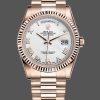Rolex Day-Date 118235 White Dial 36mm Unisex Replica Watch has a Rose Gold 36 mm Round Case with Screw Down Crown and a Rose Gold Fluted Bezel. white dial With Manufacturer Serial Numbers. The day at the 12 o’clock and the date at the 3 o’clock.Rose Gold President Bracelet with the heavy band Folding Crownclasp.