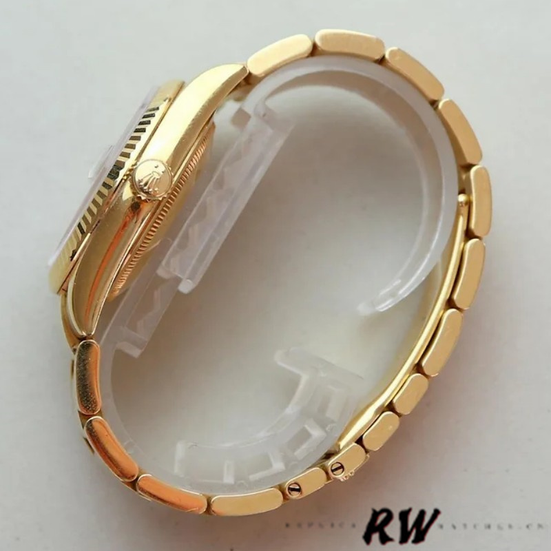 Rolex Day-Date 118238 Black MOP Diamond Dial 36mm Unisex Replica Watch.36mm yellow gold case.Polished yellow gold fluted bezel and President Bracelet.Black Mother-of-pearl Jubilee dial with yellow gold-tone hands and diamond hour markers. 8 round and 2 baguette shaped diamond hour markers.Day of the week window displayed at the 12 o’clock position.Date window displayed at the 3 o’clock position with a cyclops magnifying lens.