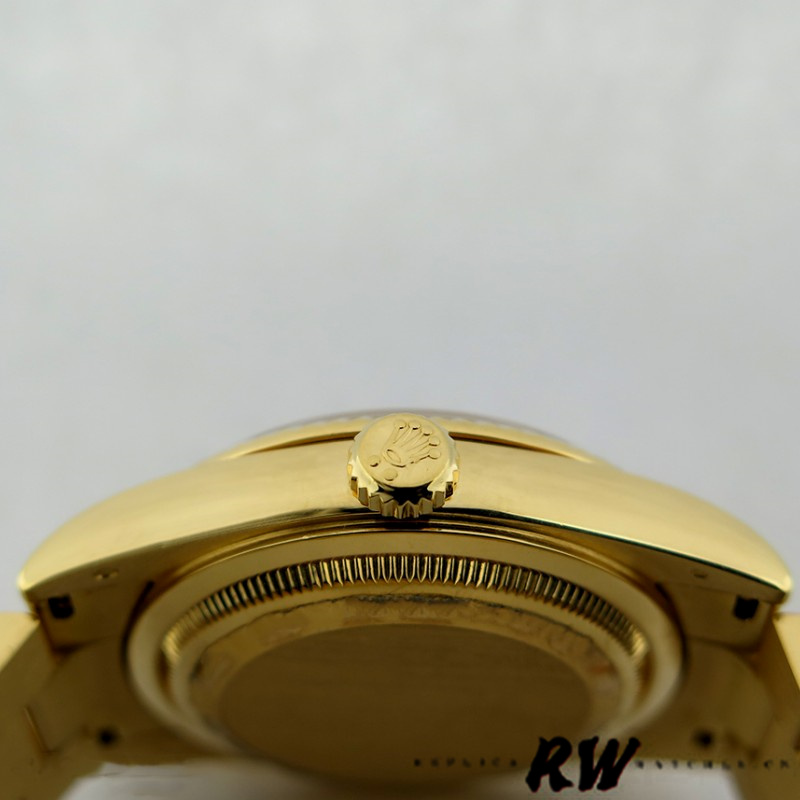 Rolex Day-Date 118238 White MOP Roman Dial 36mm Unisex Replica Watch has a Yellow Gold 36 mm Round Case with Screw Down Crown and a Yellow Gold Fluted Bezel. It has an attractive White Mother of Pearl Dial with Roman Dial Markers. and day and date display at 12 and 3 o’clock. Scratch resistant sapphire crystal. Screw down crown.The reliable Yellow Gold Oyster Bracelet will look great on your wrist.