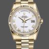 Rolex Day-Date 118238 Yellow Gold Silver Diamond Dial 36mm Unisex Replica Watch has a Yellow Gold 36 mm Round Case with Screw Down Crown and a Yellow Gold Fluted Bezel. Featuring a silver diamond dot dial housing an external Cyclops date aperture at 3 O’clock and a day aperutre in-between 11 and 1 O’clock surrounded , polished finish shoulders and case sides.Scratch resistant sapphire crystal. Screw down crown.The reliable Yellow Gold Oyster Bracelet will look great on your wrist.