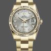 Rolex Day-Date 118238 Yellow Gold White dial Fluted Bezel 36mm Unisex Replica Watch has a Yellow Gold 36 mm Round Case with Screw Down Crown and a Yellow Gold Fluted Bezel. Featuring a white Roman numeral dial housing an external Cyclops date aperture at 3 O’clock and a day aperture in-between 11 and 1 O’clock , polished finish shoulders and case sides.Solid case back. The reliable Yellow Gold Oyster Bracelet will look great on your wrist.