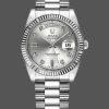Rolex Day-Date 118239 Silver Diamond Dial fluted bezel 36mm Unisex Replica Watch. 36mm white gold case with a white gold Rolex Oyster bracelet. Fixed – fluted White gold bezel.Silver dial with luminous hands and diamond hour marker. Minute markers on the outer dial.Day of the week window displayed at the 12 o’clock position.Date window displayed at the 3 o’clock position with a cyclops magnifying lens.Scratch resistant sapphire crystal. Screw down crown.Will fit up to a 6.75-inch wrist.