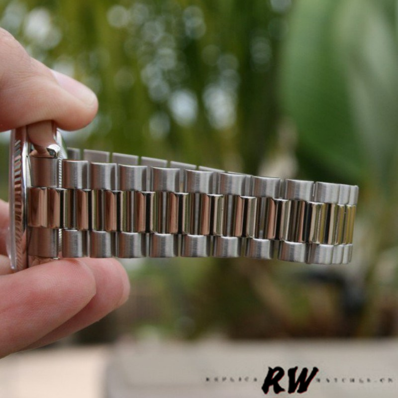 Rolex Day-Date 118239 White Gold Silver dial Fluted Bezel 36mm Unisex Replica Watch. 36mm White Gold case with a white gold Rolex Oyster bracelet. Fixed – fluted White gold bezel.Silver dial featuring stick markers.Day of the week window displayed at the 12 o’clock position.Date window displayed at the 3 o’clock position with a cyclops magnifying lens.Scratch resistant sapphire crystal. Screw down crown.