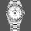 Rolex Day Date 118339 White Gold Silver Dial Fluted Bezel 36mm Unisex Replica Watch has a White Gold 36 mm Round Case with Screw Down Crown and a White Gold Fluted Bezel. Diamond lugs on a white gold presidential bracelet, Silver dial with square and baguette diamond markers (very rare), date at 3 o’clock, day at 12, The reliable White Gold Oyster Bracelet will look great on your wrist.