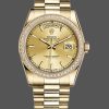 Rolex Day Date 118348 Champagne Jubilee Diamond Dial Yellow Gold 36mm Unisex Replica Watch. 36 mm Yellow Gold Round Case with Screw Down Crown and Diamonds Bezel .Champagne Jubilee Diamond Dial is a batton type and is set with diamonds.Day of the week window displayed at the 12 o’clock position.Date window displayed at the 3 o’clock position with a cyclops magnifying lens.The dial is surrounded by set round brilliant cut diamond bezel, The elegantly designed with Concealed Folding Crownclasp will look great on your wrist.