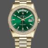 Rolex Day Date 118348 Green Diamond Dial Yellow Gold 36mm Unisex Replica Watch. 36 mm Yellow Gold brushed and polished tonneau Case with Screw Down Crown and Diamonds Bezel .green enamel and diamond set dial with applied green Arabic numerals, gold baton hands with centre seconds, Day of the week window displayed at the 12 o’clock position.Date window displayed at the 3 o’clock position with a cyclops magnifying lens.The dial is surrounded by set round brilliant cut diamond bezel, The elegantly designed with Concealed Folding Crownclasp will look great on your wrist.