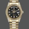 Rolex Day-Date 118388 Black Diamond Rubies Dial 36mm Unisex Replica Watch features a 36mm Diamond set yellow gold case fitted with a diamond set black dial, Diamond-encrusted lugs, a matching diamond bezel, 8 round diamonds and 2 baguette shaped ruby hour markers.Polished yellow gold hands, hour and minute hands, Scratch resistant sapphire crystal with cyclops magnifier. Day of the week window displayed at the 12 o’clock position.Date window displayed at the 3 o’clock position.The elegantly designed with Concealed Folding Crownclasp will look great on your wrist.