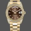 Rolex Day-Date 118388 Champagne Roman Numeral Dial 36MM Unisex Replica Watch features a 36mm Diamond set yellow gold case , Champagne Dial with Roman Numeral Hour Markers, Diamond-encrusted lugs, a matching diamond bezel, hour and minute hands, Scratch resistant sapphire crystal with cyclops magnifier. Day of the week window displayed at the 12 o’clock position.Date window displayed at the 3 o’clock position.The elegantly designed with Concealed Folding Crownclasp will look great on your wrist.