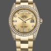 Rolex Day-Date 118388 Diamond Bezel Champagne Index Dial 36MM Unisex Replica Watch features a 36mm Diamond set yellow gold case,Champagne Dial with Index Hour Markers, Diamond-encrusted lugs, a matching diamond bezel, hour and minute hands, Scratch resistant sapphire crystal with cyclops magnifier. Day of the week window displayed at the 12 o’clock position.Date window displayed at the 3 o’clock position.The elegantly designed with Concealed Folding Crownclasp will look great on your wrist.