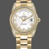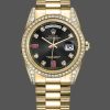Rolex Day-Date 118388 yellow gold Black Diamond Dial 36mm Unisex Replica Watch features a 36mm Diamond set yellow gold case fitted with a diamond set black dial, Diamond-encrusted lugs, a matching diamond bezel, Scratch resistant sapphire crystal with cyclops magnifier. Day of the week window displayed at the 12 o’clock position.Date window displayed at the 3 o’clock position.The elegantly designed with Concealed Folding Crownclasp will look great on your wrist.