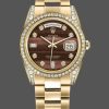 Rolex Day-Date 118388 Yellow Gold Black Index Dial 36mm Unisex Replica Watch features a 36mm Diamond set yellow gold case fitted with Black Dial Index Hour Markers, Diamond-encrusted lugs, a matching diamond bezel, hour and minute hands, Scratch resistant sapphire crystal with cyclops magnifier. Day of the week window displayed at the 12 o’clock position.Date window displayed at the 3 o’clock position.The elegantly designed with Concealed Folding Crownclasp will look great on your wrist.