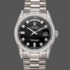 Rolex Day-Date 118389 Silver Roman Numeral Dial 36MM Unisex Replica Watch features a 36mm white gold case ,Silver Dial with Roman Numeral Hour Markers with Diamonds Set on Bezel and Lugs, Scratch resistant sapphire crystal with cyclops magnifier. Day of the week window displayed at the 12 o’clock position.Date window displayed at the 3 o’clock position.White gold Presidential bracelet with folding buckle.