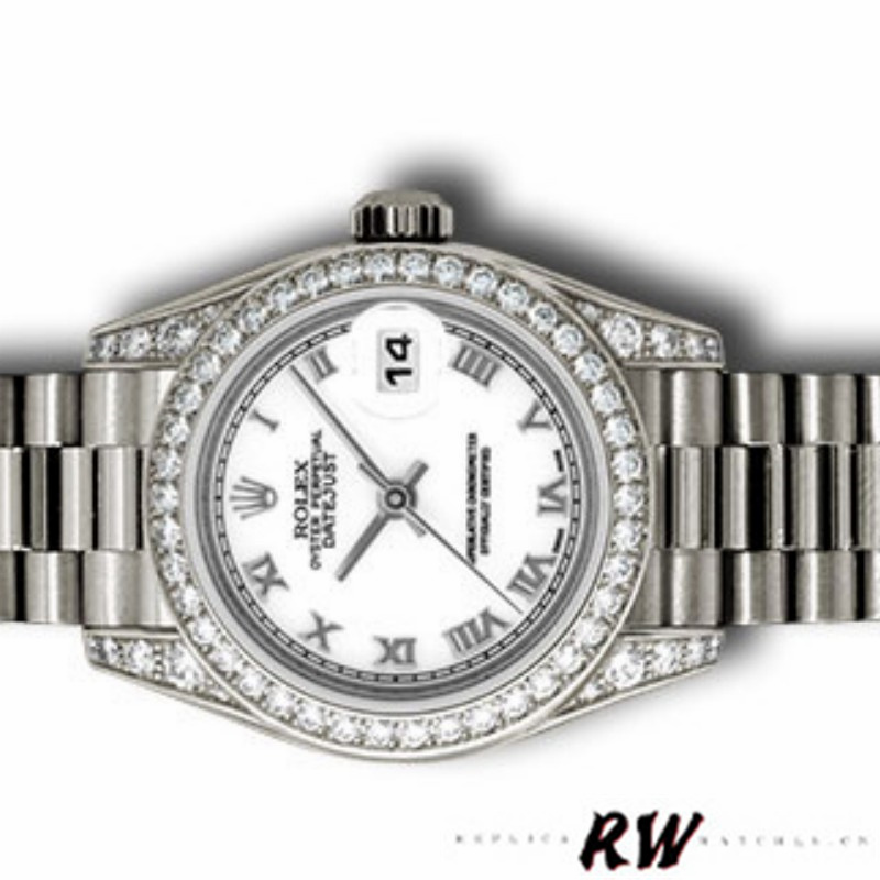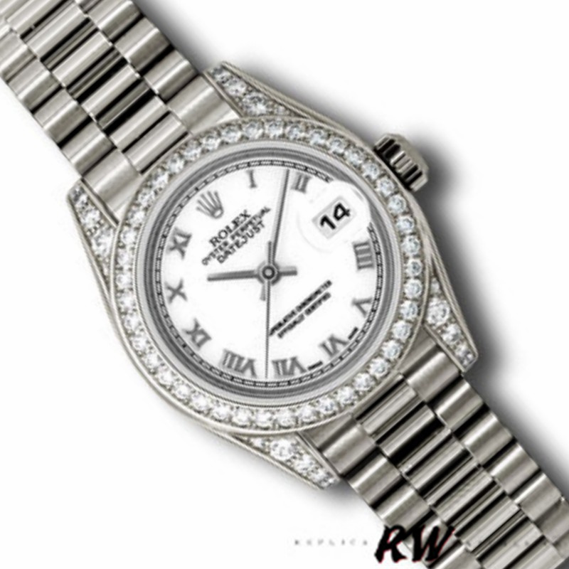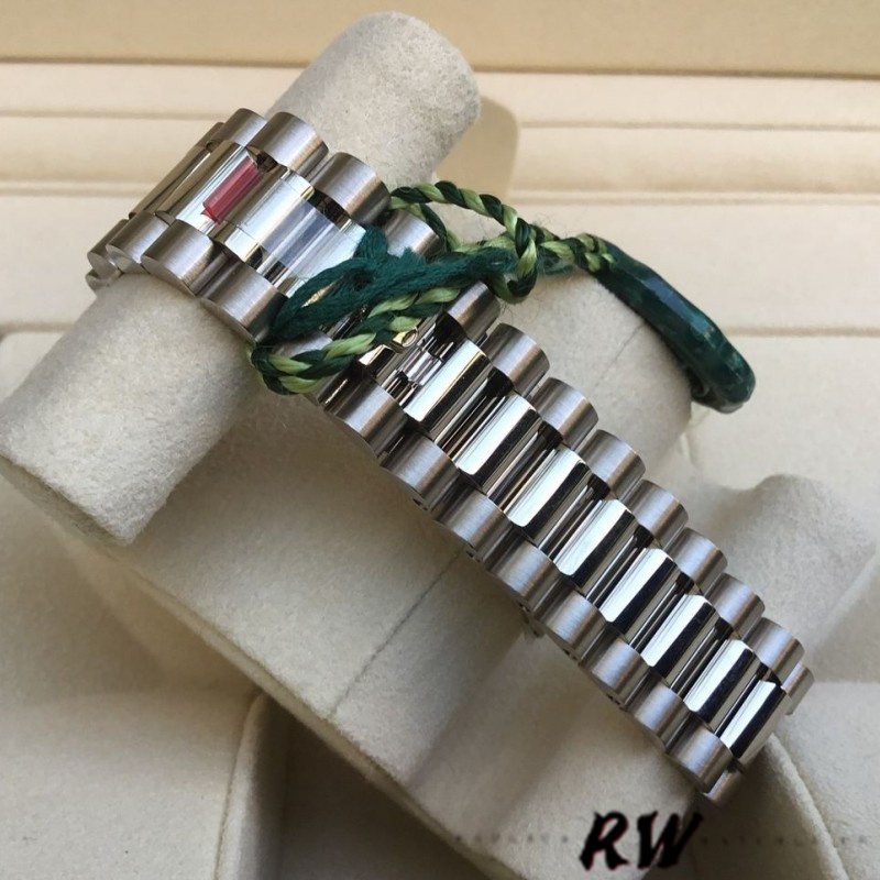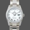 Rolex Day-Date 118389 White Gold White Roman Numeral Dial 36MM Unisex Replica Watch features a 36mm white gold case ,White Dial with Roman Numeral Hour Markers with Diamonds Set on Bezel and Lugs, Scratch resistant sapphire crystal with cyclops magnifier. Day of the week window displayed at the 12 o’clock position.Date window displayed at the 3 o’clock position.White gold Presidential bracelet with folding buckle.