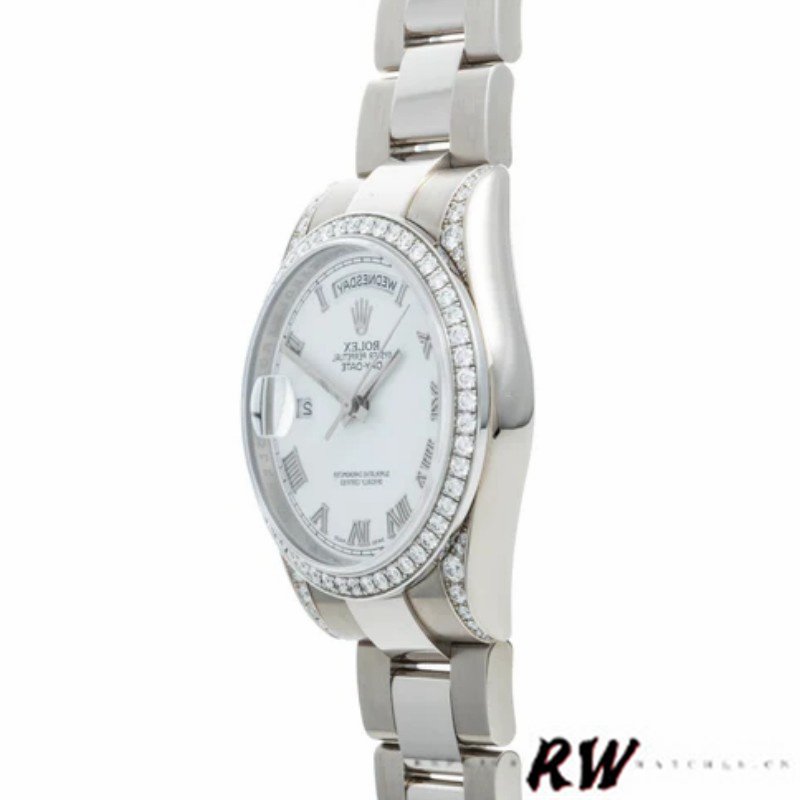 Rolex Day-Date 118389 White Roman Numeral Dial 36MM Unisex Replica Watch features a 36mm white gold case ,White Dial with Roman Numeral Hour Markers with Diamonds Set on Bezel and Lugs, Scratch resistant sapphire crystal with cyclops magnifier. Day of the week window displayed at the 12 o’clock position.Date window displayed at the 3 o’clock position.White gold Presidential bracelet with folding buckle.