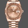 Rolex Day-Date 218235 Chocolate Brown Dial Rose Gold 41MM Mens Replica Watch, has a 41mm rose gold case that has a solid case back, a sapphire crystal, a screw-down crown, and a fluted rose gold bezel.Scratch resistant sapphire crystal with Cyclops magnifier.Chocolate Brown Dial with Roman Markers.Date Window Displayed at 3 O’Clock,Day Window Displayed at 12 O’Clock,Rose gold three-piece-link Presidential bracelet with a fold-over clasp.
