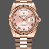 Rolex Day-Date 218235 Rose Roman Dial Rose Gold 41MM Mens Replica Watch, has a 41mm rose gold case that has a solid case back,a screw-down crown, and a fluted rose gold bezel.Scratch resistant sapphire crystal with Cyclops magnifier.Rose Dial with Roman Numerals Hour Markers.Date Window Displayed at 3 O’Clock,Day Window Displayed at 12 O’Clock,Rose gold three-piece-link Presidential bracelet with a fold-over clasp.