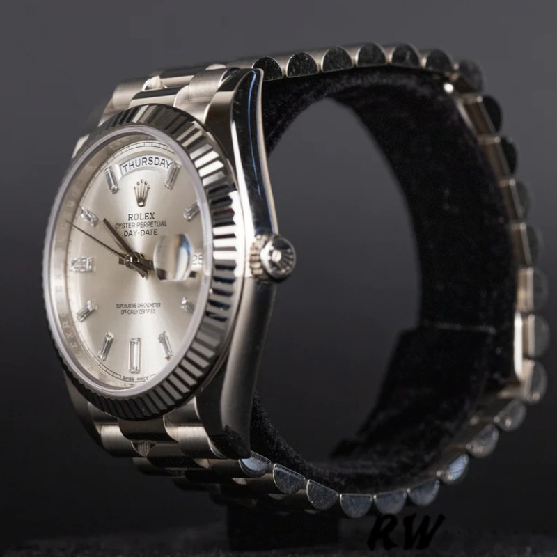 Rolex Day-Date 228239 Silver Baguette Diamond Dial Fluted Bezel 40mm Mens Replica Watch, featuring a 40mm White Gold case, solid case back with screw-down crown and fluted bezel. Scratch-resistant sapphire crystal with Cyclops magnifying glass.Silver Dial with 10 Baguette-Cut Diamond Hour Markers, date window at 3 o’clock, day of the week window at 12 o’clock,White Gold three-piece presidential bracelet with deployant clasp.