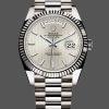 Rolex Day-Date 228239 Silver Quadrant Motif Roman Dial Fluted Bezel 40mm Mens Replica Watch, featuring a 40mm White Gold case, solid case back with screw-down crown and fluted bezel. Scratch-resistant sapphire crystal with Cyclops magnifying glass.Silver Quadrant Motif Dial with Roman Numeral Hour Markers, date window at 3 o’clock, day of the week window at 12 o’clock,White Gold three-piece presidential bracelet with deployant clasp.