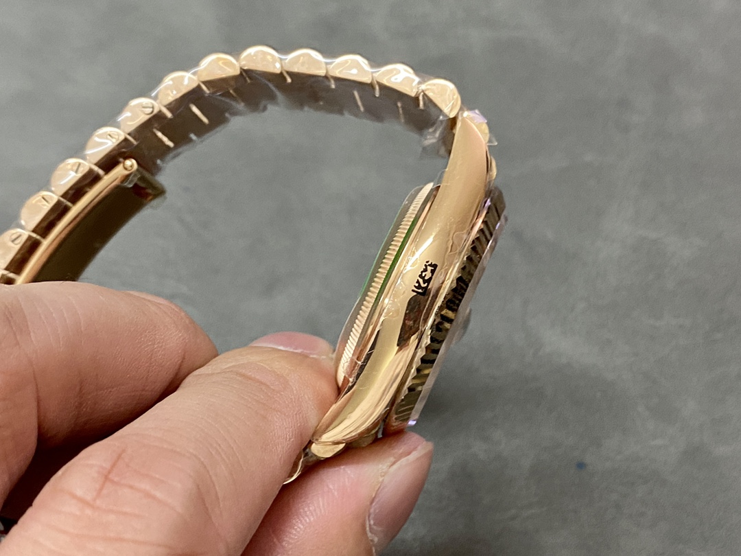 Rolex Day-Date 128235 Everose Gold Pink Rose Dial 36MM Unisex Replica Watch, 36.0 mm Everose rose gold oyster case in diameter, screw-down back, screw-down crown with twinlock double waterproofness system, fluted bezel, Scratch resistant sapphire crystal with cyclops magnifier, Pink Rose Dial with Diamond Hour Markers, Outer minute and 1/2 seconds divisions, aperture for day at 12, aperture for date at 3. Everose gold President bracelet with semi-circular three-piece links, concealed folding Crownclasp buckle.