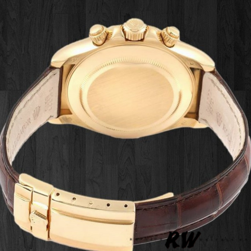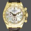 Rolex Daytona 116518 MOP Diamond Dial Brown Leather strap 40mm Mens Replica Watch. 40mm Yellow gold Case. Fixed Tachymeter Engraved Bezel. Scratch resistant sapphire crystal. Mother of pearl dial with diamond hour markers. Small seconds hand at 6 o’clock. Centre chronograph hand, 30-minute counter at 3 o’clock and 12-hour counter at 9 o’clock. Brown leather strap with yellow gold deployent buckle.which looks pretty stunning and high-end.